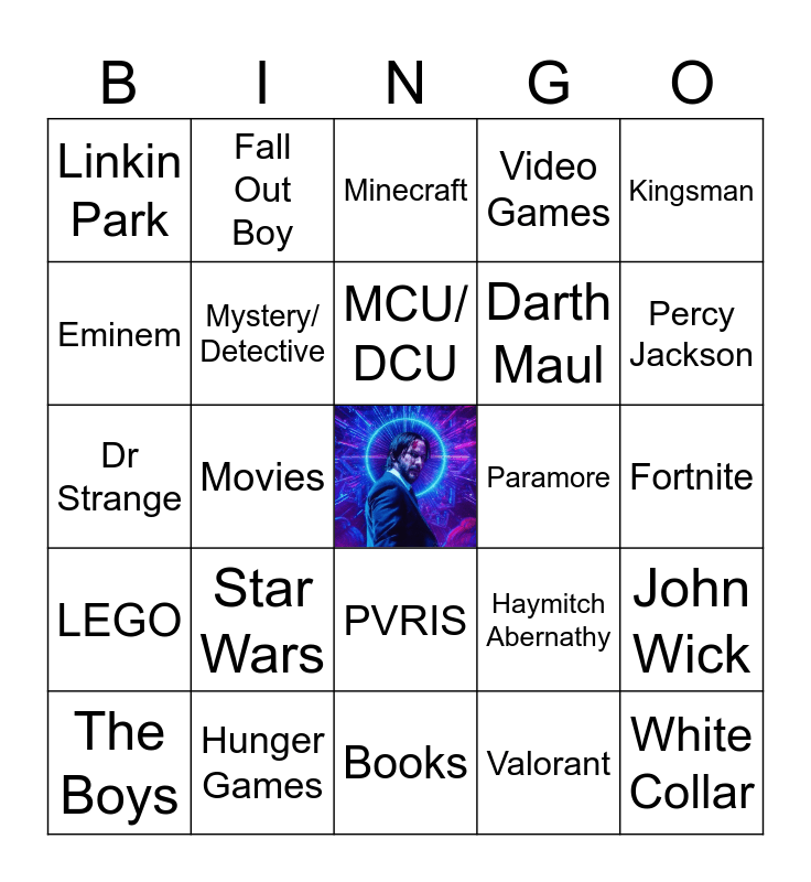 This bingo card has a free space and 24 words: Star Wars, Hunger Games, MCU/ DCU, The Boys, Kingsman, Linkin Park, Eminem, Fall Out Boy, Paramore, PVRIS, Darth Maul, Dr Strange, Haymitch Abernathy, John Wick, Mystery/ Detective, Valorant, Fortnite, Minecraft, Percy Jackson, Movies, White Collar, LEGO, Video Games and Books.