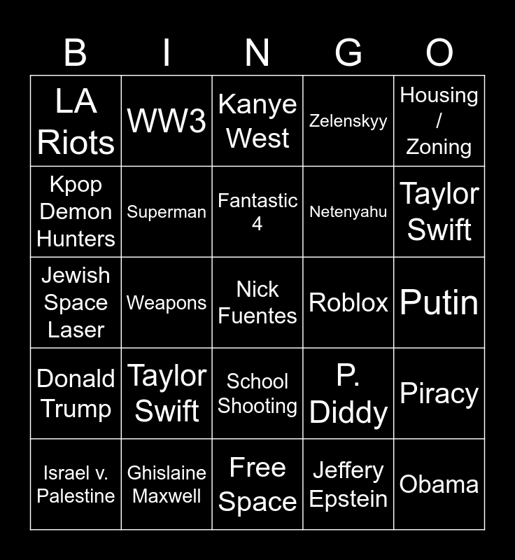 This bingo card has 25 words: Donald Trump, Ghislaine Maxwell, Nick Fuentes, Jeffery Epstein, Housing / Zoning, LA Riots, WW3, Kanye West, Roblox, Piracy, Kpop Demon Hunters, Superman, Free Space, P. Diddy, Taylor Swift, Israel v. Palestine, Weapons, Fantastic 4, Netenyahu, Putin, Jewish Space Laser, Taylor Swift, School Shooting, Zelenskyy and Obama.