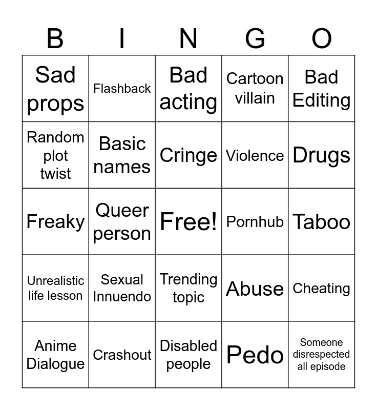 This bingo card has a free space and 37 words: Racism, Someone’s creepy, Kissing, Basic names, Cheating, Sexual Innuendo, Cringe, Guns, Bad Editing, Murder, Queer person, Cartoon villain, Someone disrespected all episode, Taboo, Random plot twist, Unrealistic life lesson, Time skip, Bad acting, Trending topic, Pornhub, Sad props, Drugs, Anime Dialogue, Disabled people, Supernatural occurrence, Pedo, Flashback, Crashout, Fight, Bully, Sexism, Crashout, Freaky, Bad main character, Abuse, Violence and Weird Coincidence.