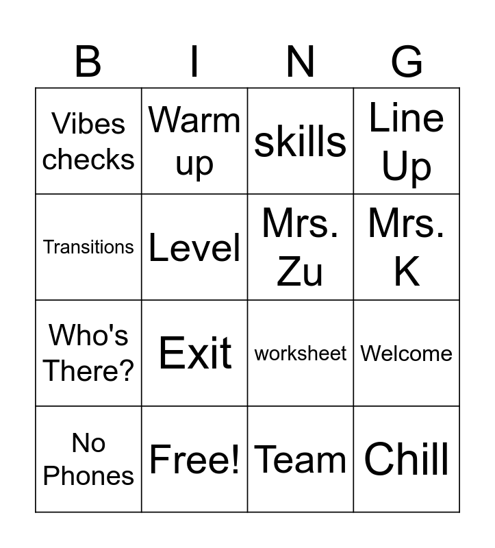 This bingo card has 16 words: Free!, Welcome, skills, Vibes checks, Who's There?, Warm up, worksheet, Team, Transitions, Level, No Phones, Line Up, Exit, Mrs. K, Mrs. Zu and Chill.