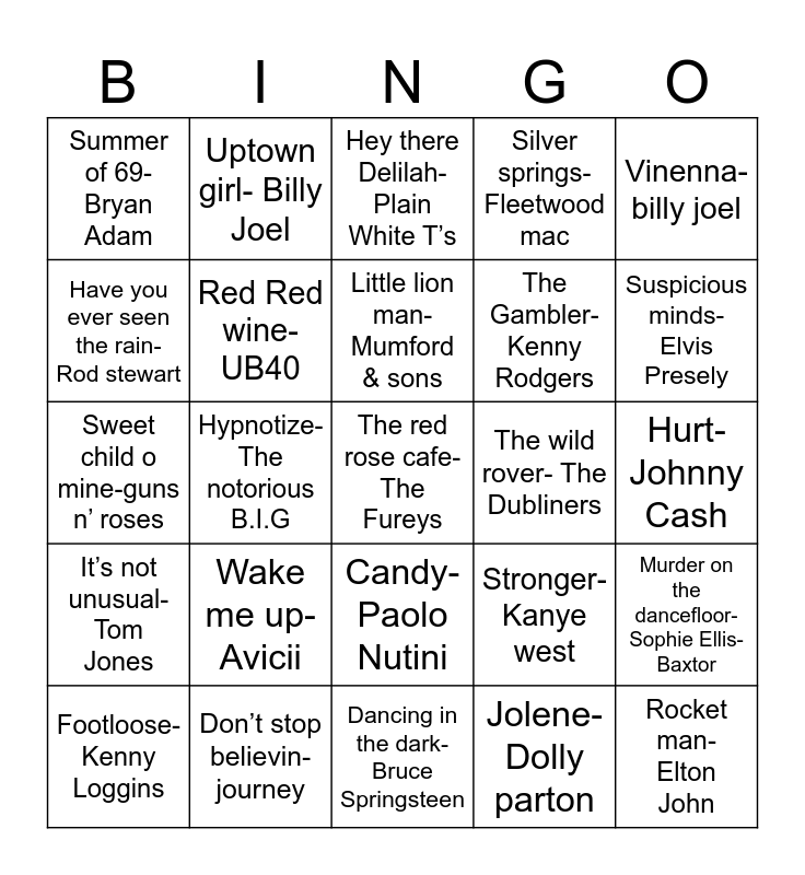 This bingo card has 40 words: Born in USA- Bruce Springsteen, Sweet child o mine-guns n’ roses, Super Trouper-ABBA, Red Red wine- UB40, Don’t stop believin- journey, Candy- Paolo Nutini, Little lion man- Mumford & sons, Dancing queen-ABBA, Vinenna-billy joel, It’s not unusual-Tom Jones, Hypnotize-The notorious B.I.G, Silver springs-Fleetwood mac, The red rose cafe- The Fureys, Hurt- Johnny Cash, The wild rover- The Dubliners, Wake me up- Avicii, A sky full of stars-Coldplay, Summer of 69-Bryan Adam, Fast car- Tracy Chapman, Hey there Delilah- Plain White T’s, Murder on the dancefloor- Sophie Ellis-Baxtor, Jolene-Dolly parton, The Gambler-Kenny Rodgers, Have you ever seen the rain-Rod stewart, Three little birds-Bob marley, Maggie may- Rod Stewart, The man who can’t be moved- The Script, Sweet Caroline- neil diamond, Rocket man- Elton John, Burning love- Elvis, YMCA-Village people, Footloose-Kenny Loggins, Cold heart- Dua lipa, Elton john, Stronger- Kanye west, Suspicious minds-Elvis Presely, Dancing in the dark-Bruce Springsteen, Galway girl-Mundy, Viva la vida- Coldplay, Uptown girl- Billy Joel and Crazy little thing called love- Queen.
