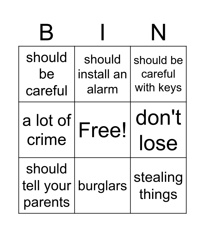 This bingo card has a free space and 11 words: installing an alarm system, burglars, stealing things, should tell your parents, should install an alarm, should be careful with keys, don't lose, leave near an open window, a lot of crime, should be careful and better safe than sorry.
