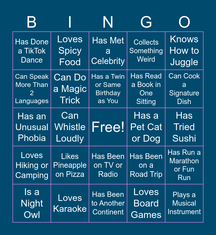 This bingo card has a free space and 24 words: Likes Pineapple on Pizza, Loves Karaoke, Has a Twin or Same Birthday as You, Is a Night Owl, Knows How to Juggle, Has Done a TikTok Dance, Can Speak More Than 2 Languages, Loves Spicy Food, Has a Pet Cat or Dog, Has Been on TV or Radio, Has Read a Book in One Sitting, Has an Unusual Phobia, Has Been on a Road Trip, Has Run a Marathon or Fun Run, Can Do a Magic Trick, Loves Board Games, Has Tried Sushi, Has Met a Celebrity, Can Cook a Signature Dish, Can Whistle Loudly, Plays a Musical Instrument, Loves Hiking or Camping, Collects Something Weird and Has Been to Another Continent.