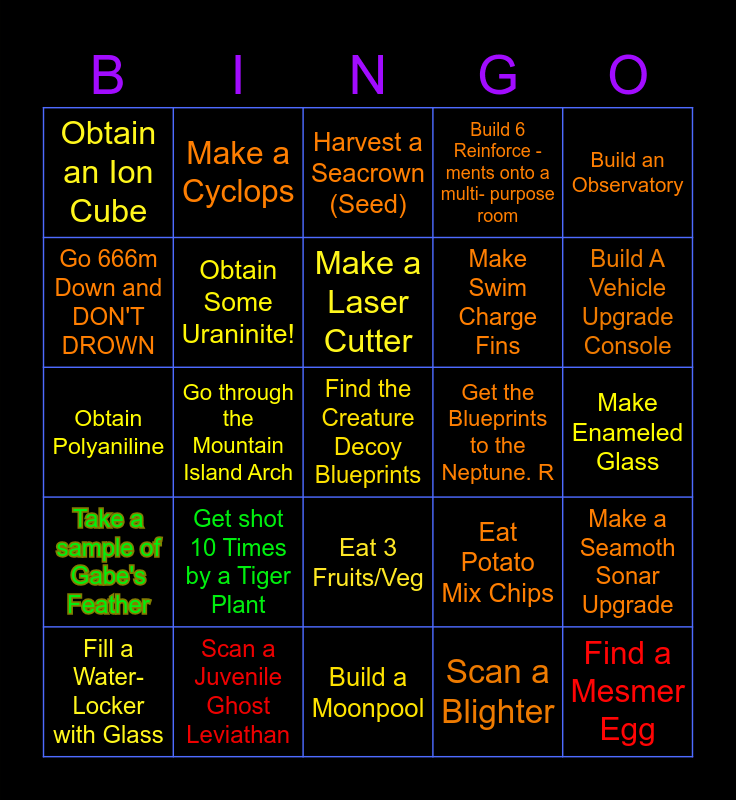This bingo card has 30 words: Scan a Juvenile Ghost Leviathan, Scan Nuclear Reactor Fragment, Go through the Mountain Island Arch, Make a Pathfinder Tool, Obtain an Ion Cube, Harvest a Seacrown (Seed), Obtain Some Uraninite!, Eat 3 Fruits/Veg, Get the Blueprints to the Neptune. R, Build a Moonpool, Make Enameled Glass, Find the Creature Decoy Blueprints, Scan a Blighter, Find a Mesmer Egg, Build A Vehicle Upgrade Console, Cure a Spinefish and Consume it, Eat Potato Mix Chips, Take a sample of Gabe's Feather, Get shot 10 Times by a Tiger Plant, Build an Observatory, Obtain Polyaniline, Scan the Ancient Floaters, Make a Cyclops, Make Swim Charge Fins, Go 666m Down and DON'T DROWN, Build 6 Reinforce -ments onto a multi- purpose room, Make a Seamoth Sonar Upgrade, Fill a Water-Locker with Glass, Make a Laser Cutter and Die Via Floaters.