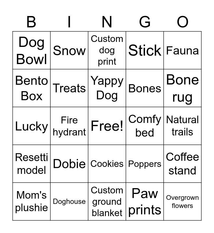 This bingo card has a free space and 24 words: Dobie, Doghouse, Yappy Dog, Mom's plushie, Fauna, Dog Bowl, Bento Box, Snow, Comfy bed, Cookies, Bones, Lucky, Poppers, Coffee stand, Treats, Paw prints, Natural trails, Custom dog print, Bone rug, Fire hydrant, Overgrown flowers, Resetti model, Stick and Custom ground blanket.