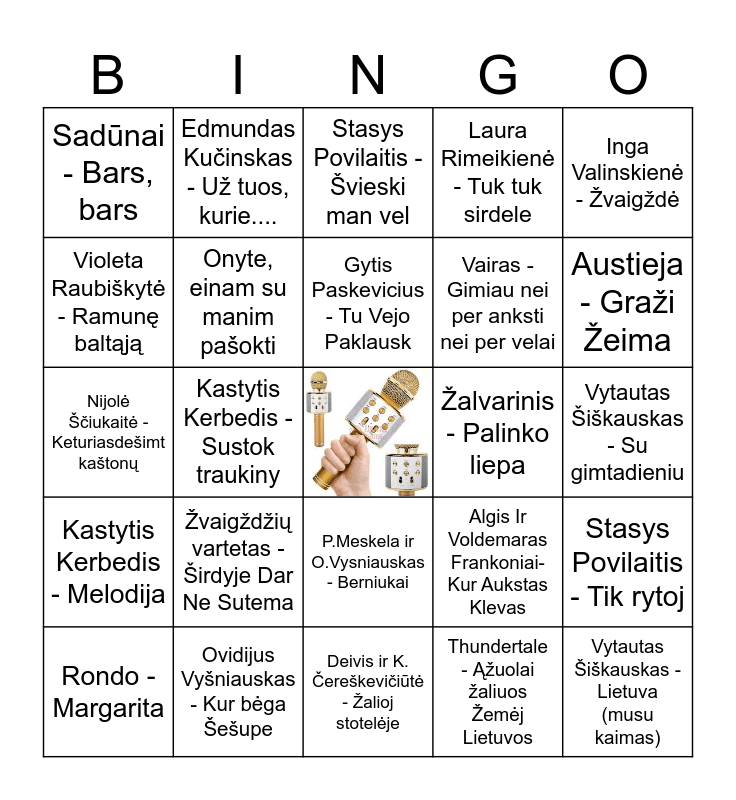 This bingo card has a free space and 40 words: Nijole Ščiukaitė - Baltas balandis, Nijolė Ščiukaitė - Keturiasdešimt kaštonų, Nijole Tallat-Kelpsaite - Alyvos zydes, Onyte, einam su manim pašokti, Ovidijus Vyšniauskas - Kur bėga Šešupe, P.Meskela ir O.Vysniauskas - Berniukai, Gytis Paskevicius - Tu Vejo Paklausk, Gytis Paškevičius - Draugams, Inga Valinskienė - Žvaigždė, Kastytis Kerbedis - Melodija, Kastytis Kerbedis - Sustok traukiny, Laura Rimeikienė - Tuk tuk sirdele, Vytautas Šiškauskas - Lietuva (musu kaimas), Vytautas Šiškauskas - Su gimtadieniu, Žalvarinis - Palinko liepa, Žvaigždžių vartetas - Širdyje Dar Ne Sutema, Lietuvaičiai - Mūsų dienos kaip švente, Sadūnai - Bars, bars, Senieji Vilniaus Stogai, Stasys Povilaitis - Švieski man vel, Stasys Povilaitis - Tik rytoj, Thundertale - Ąžuolai žaliuos Žemėj Lietuvos, Vairas - Gimiau nei per anksti nei per velai, Violeta Raubiškytė - Ramunę baltąją, Vitalijus Pauliukas - Raganų puota, Poliarizuoti stiklai - Medžiai be lapu, Radži Ką Daryt, Rebelheart ir Stasys Povilaitis - Gal Ir Teks, Rytis Cicinas - Meiles laivas, Rytis Cicinas - Ne, nereikia ašarų, Romas Dambrauskas - Rudeninis paukštis, Rondo - Margarita, Rondo - Netikek ką priešai suoks, Algis Ir Voldemaras Frankoniai-Kur Aukstas Klevas, Austieja - Graži Žeima, Deivis ir K. Čereškevičiūtė - Žalioj stotelėje, Delfinai- Ačiū tau, Dumas - Kalnuos dainuoja (Rageliai), Edmundas Kučinskas - Už tuos, kurie.... and EL Fuego - Aleliuja.
