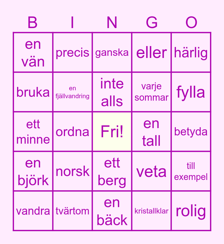 This bingo card has a free space and 29 words: vandra, en naturguide, ordna, förstå, en vän, ganska, en fjällvandring, norsk, en tall, tvärtom, betyda, rolig, en bäck, kristallklar, fylla, en kopp, ett berg, en björk, härlig, ett minne, veta, komma fram, varje sommar, bruka, eller, precis, till exempel, inte alls and lugn.