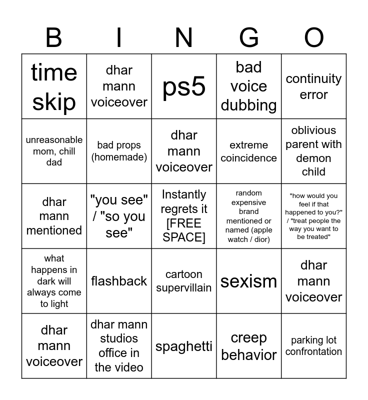 This bingo card has a free space and 29 words: dhar mann voiceover, dhar car, "you see" / "so you see", merch in video, time skip, ps5, bad props (homemade), flashback, random expensive brand mentioned or named (apple watch / dior), dhar mann studios office in the video, "how would you feel if that happened to you?" / "treat people the way you want to be treated", parking lot confrontation, spaghetti, creep behavior, oblivious parent with demon child, kids with ipad, cartoon supervillain, what happens in dark will always come to light, continuity error, dhar mann mentioned, sexism, someone fired over something small, extreme coincidence, unreasonable mom, chill dad, bad voice dubbing, dhar mann voiceover, dhar mann voiceover, dhar mann voiceover and dhar mann voiceover.
