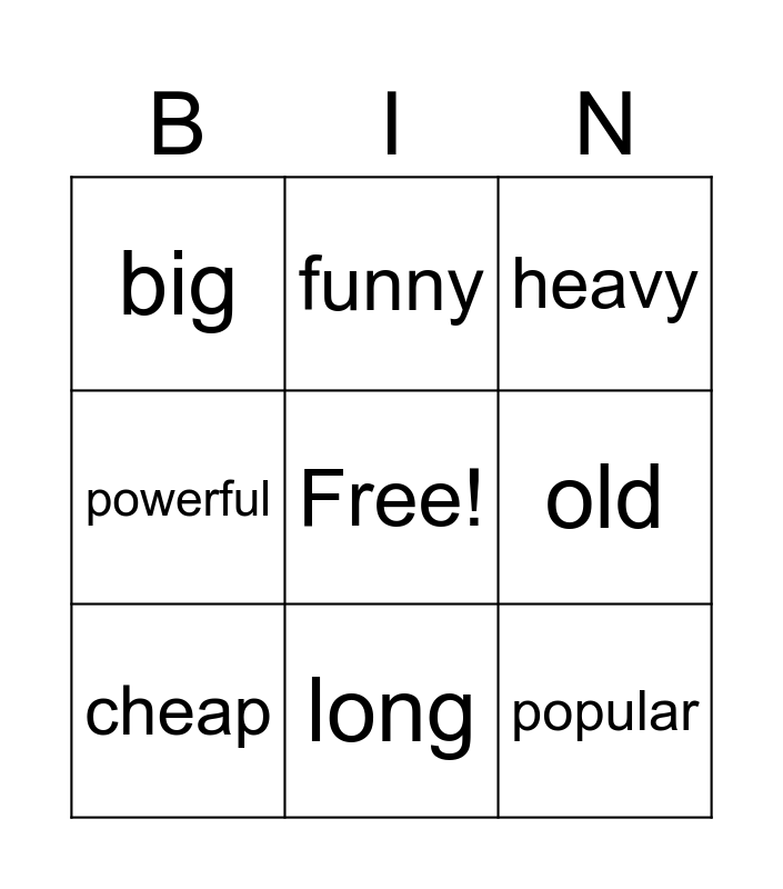 This bingo card has a free space and 17 words: bad, good, heavy, big, small, powerful, expensive, cheap, long, old, creative, fast, popular, funny, safe, light and large.