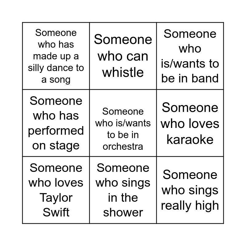 This bingo card has 9 words: Someone who loves Taylor Swift, Someone who is/wants to be in band, Someone who can whistle, Someone who has performed on stage, Someone who has made up a silly dance to a song, Someone who loves karaoke, Someone who is/wants to be in orchestra, Someone who sings really high and Someone who sings in the shower.