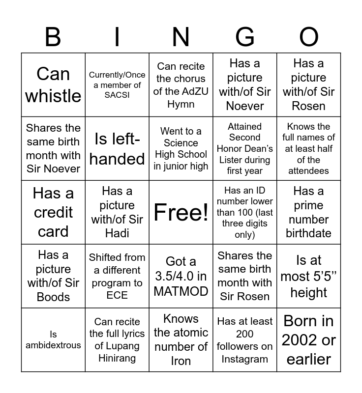 This bingo card has a free space and 39 words: Is currently wearing a watch, Went to AdZU for SHS, Has a driver’s license, Is left-handed, Is ambidextrous, Got a 3.5/4.0 in MATMOD, Went to a Science High School in junior high, Brought a tumbler, Has a picture with/of Sir Rosen, Has a picture with/of Sir Boods, Has a picture with/of Sir Hadi, Has a picture with/of Sir Noever, Born in 2002 or earlier, Has a prime number birthdate, Has an ID number lower than 100 (last three digits only), Shifted from a different program to ECE, Has the letter Z in their name, Can whistle, Speaks at least 4 languages, Shares the same birth month with Sir Rosen, Shares the same birth month with Sir Noever, Knows the atomic number of Iron, Attained Second Honor Dean’s Lister during first year, Knows the full names of at least half of the attendees, Can sing, Can dance, Currently/Once a member of EcoWatch, Currently/Once a member of ECA, Currently/Once a member of SITEAO, Currently/Once a member of SACSI, Has an Iphone, Went abroad (with pictures), Can recite the chorus of the AdZU Hymn, Can recite the full lyrics of Lupang Hinirang, Has at least 200 followers on Instagram, Able to spell the longest word, Is at most 5’5’’ height, Has a credit card and Is currently wearing a jacket.