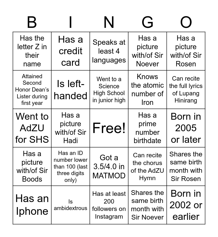 This bingo card has a free space and 40 words: Is currently wearing a watch, Went to AdZU for SHS, Has a driver’s license, Is left-handed, Is ambidextrous, Got a 3.5/4.0 in MATMOD, Went to a Science High School in junior high, Brought a tumbler, Has a picture with/of Sir Rosen, Has a picture with/of Sir Boods, Has a picture with/of Sir Hadi, Has a picture with/of Sir Noever, Born in 2002 or earlier, Born in 2005 or later, Has a prime number birthdate, Has an ID number lower than 100 (last three digits only), Shifted from a different program to ECE, Has the letter Z in their name, Can whistle, Speaks at least 4 languages, Shares the same birth month with Sir Rosen, Shares the same birth month with Sir Noever, Knows the atomic number of Iron, Attained Second Honor Dean’s Lister during first year, Knows the full names of at least half of the attendees, Can sing, Can dance, Currently/Once a member of EcoWatch, Currently/Once a member of ECA, Currently/Once a member of SITEAO, Currently/Once a member of SACSI, Has an Iphone, Went abroad (with pictures), Can recite the chorus of the AdZU Hymn, Can recite the full lyrics of Lupang Hinirang, Has at least 200 followers on Instagram, Able to spell the longest word, Is at most 5’5’’ height, Has a credit card and Is currently wearing a jacket.