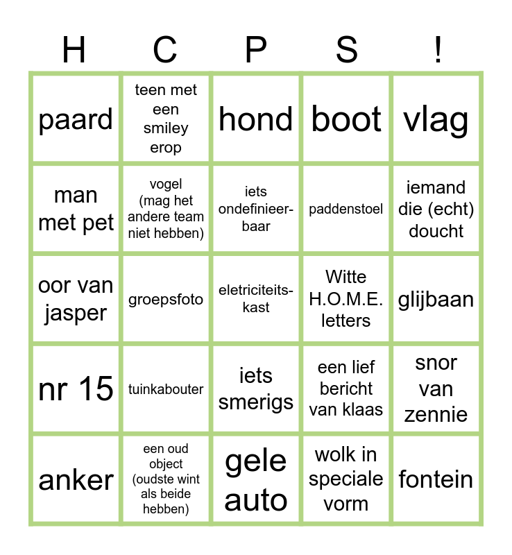 This bingo card has 25 words: tuinkabouter, gele auto, iets ondefinieer-baar, anker, vlag, paard, man met pet, teen met een smiley erop, Witte H.O.M.E. letters, iets smerigs, paddenstoel, oor van jasper, een lief bericht van klaas, snor van zennie, vogel (mag het andere team niet hebben), fontein, glijbaan, hond, iemand die (echt) doucht, groepsfoto, eletriciteits- kast, een oud object (oudste wint als beide hebben), nr 15, boot and wolk in speciale vorm.