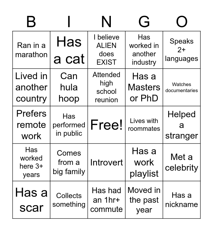 This bingo card has a free space and 24 words: Comes from a big family, Collects something, Attended high school reunion, Has a scar, Speaks 2+ languages, Ran in a marathon, Lived in another country, Has a cat, Lives with roommates, Introvert, Has a Masters or PhD, Prefers remote work, Has a work playlist, Met a celebrity, Can hula hoop, Moved in the past year, Helped a stranger, I believe ALIEN does EXIST, Watches documentaries, Has performed in public, Has a nickname, Has worked here 3+ years, Has worked in another industry and Has had an 1hr+ commute.