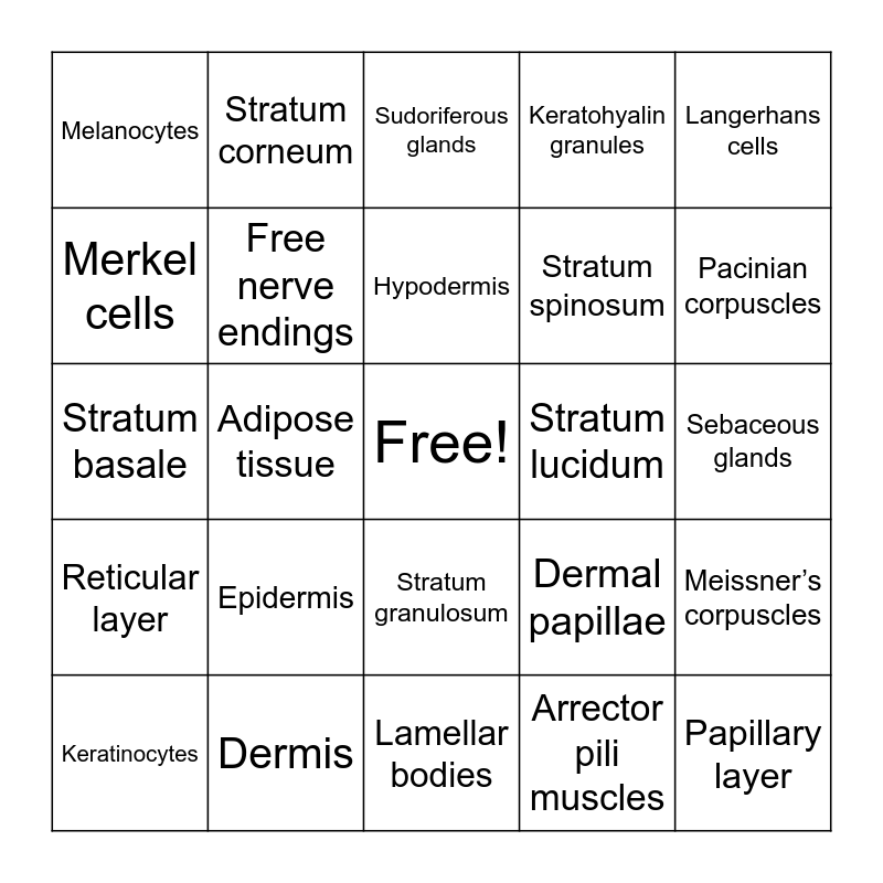 This bingo card has a free space and 24 words: Epidermis, Dermis, Hypodermis, Keratinocytes, Langerhans cells, Melanocytes, Merkel cells, Stratum corneum, Stratum lucidum, Stratum granulosum, Stratum spinosum, Stratum basale, Dermal papillae, Meissner’s corpuscles, Free nerve endings, Arrector pili muscles, Sebaceous glands, Sudoriferous glands, Pacinian corpuscles, Adipose tissue, Papillary layer, Reticular layer, Keratohyalin granules and Lamellar bodies.