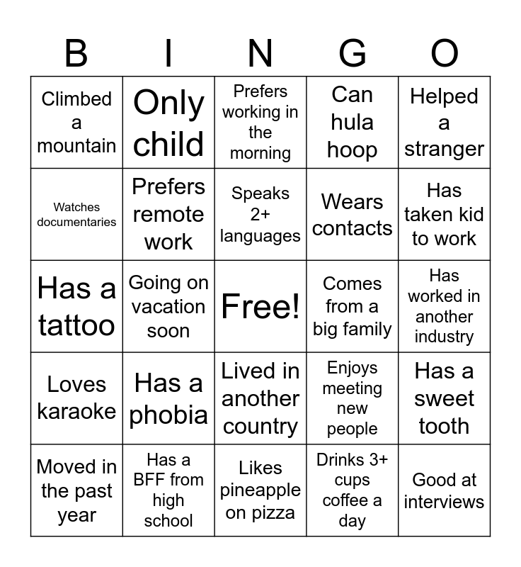 This bingo card has a free space and 24 words: Has a phobia, Has a BFF from high school, Speaks 2+ languages, Moved in the past year, Helped a stranger, Climbed a mountain, Watches documentaries, Only child, Comes from a big family, Lived in another country, Wears contacts, Has a tattoo, Enjoys meeting new people, Has a sweet tooth, Prefers remote work, Drinks 3+ cups coffee a day, Has worked in another industry, Prefers working in the morning, Has taken kid to work, Going on vacation soon, Good at interviews, Loves karaoke, Can hula hoop and Likes pineapple on pizza.