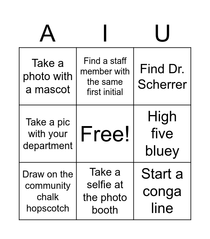 This bingo card has a free space and 13 words: Find the gold star, Find someone wearing AIU merch or colors, Draw on the community chalk hopscotch, Find a staff member with the same first initial, Take a pic with your department, Start a conga line, Explore obstacle course, Brought canned good, Take a selfie at the photo booth, Take a photo with a mascot, High five bluey, Find Dr. Scherrer and Visit Bruster’s.