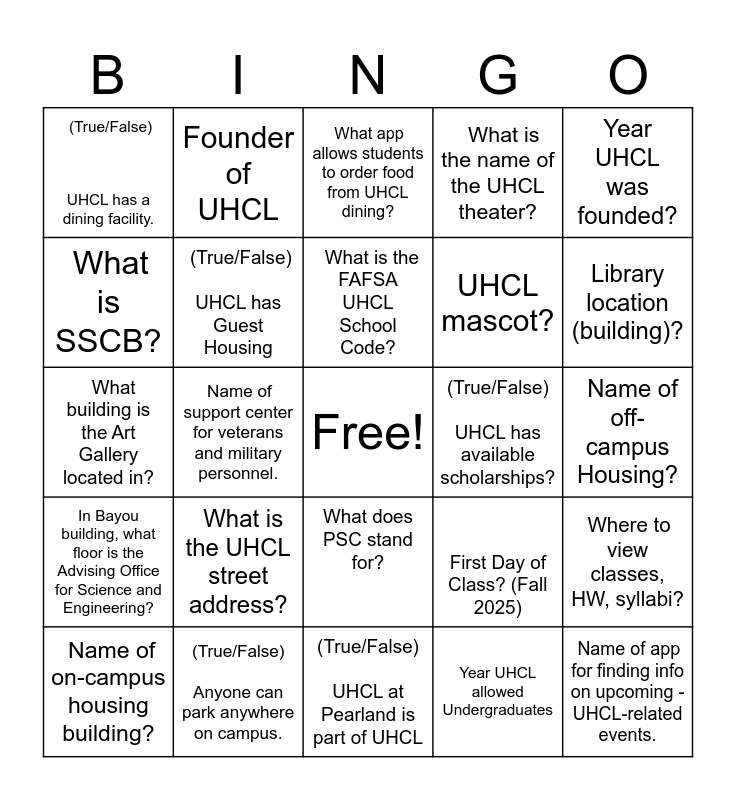 This bingo card has a free space and 24 words: What is the UHCL street address?, (True/False) Anyone can park anywhere on campus., What is the FAFSA UHCL School Code?, Name of on-campus housing building?, Year UHCL was founded?, (True/False) UHCL has a dining facility., What is SSCB?, Founder of UHCL, (True/False) UHCL has available scholarships?, What does PSC stand for?, UHCL mascot?, What building is the Art Gallery located in?, First Day of Class? (Fall 2025), Where to view classes, HW, syllabi?, (True/False) UHCL has Guest Housing, Year UHCL allowed Undergraduates, Name of off-campus Housing?, What app allows students to order food from UHCL dining?, Library location (building)?, Name of support center for veterans and military personnel., Name of app for finding info on upcoming -UHCL-related events., In Bayou building, what floor is the Advising Office for Science and Engineering?, What is the name of the UHCL theater? and (True/False) UHCL at Pearland is part of UHCL.