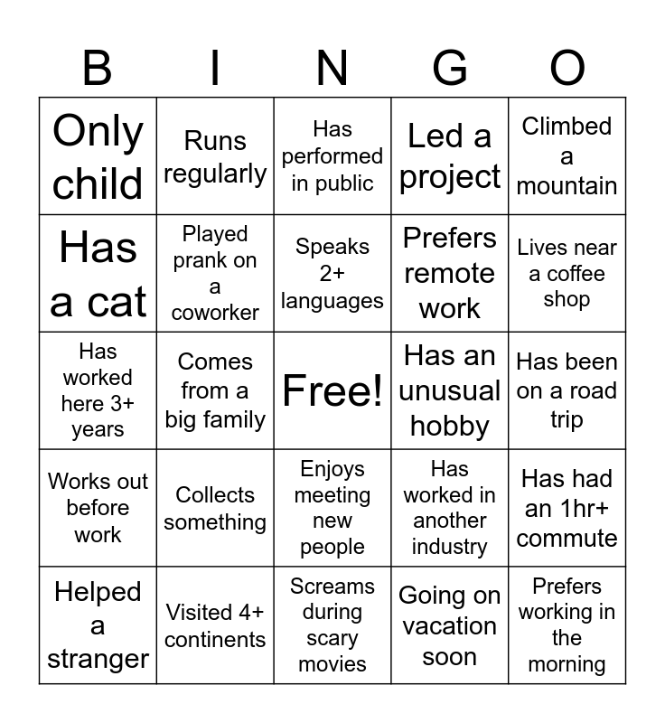 This bingo card has a free space and 24 words: Collects something, Visited 4+ continents, Speaks 2+ languages, Helped a stranger, Climbed a mountain, Only child, Has a cat, Runs regularly, Has an unusual hobby, Enjoys meeting new people, Prefers remote work, Has worked here 3+ years, Has worked in another industry, Has had an 1hr+ commute, Played prank on a coworker, Going on vacation soon, Has been on a road trip, Has performed in public, Lives near a coffee shop, Comes from a big family, Prefers working in the morning, Works out before work, Led a project and Screams during scary movies.