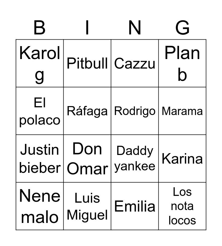 This bingo card has 16 words: Luis Miguel, Karina, Cazzu, Karol g, Justin bieber, Pitbull, Daddy yankee, Emilia, El polaco, Ráfaga, Nene malo, Plan b, Don Omar, Marama, Rodrigo and Los nota locos.