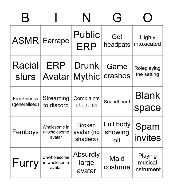 This bingo card has a free space and 24 words: Wholesome in unwholesome avatar, Unwholesome in wholesome avatar, Drunk Mythic, Furry, Highly intoxicated, ASMR, Racial slurs, Earrape, Soundboard, Broken avatar (no shaders), Game crashes, Freakniness (generalised), Full body showing off, Spam invites, ERP Avatar, Maid costume, Blank space, Public ERP, Roleplaying the setting, Streaming to discord, Playing musical instrument, Femboys, Get headpats and Absurdly large avatar.
