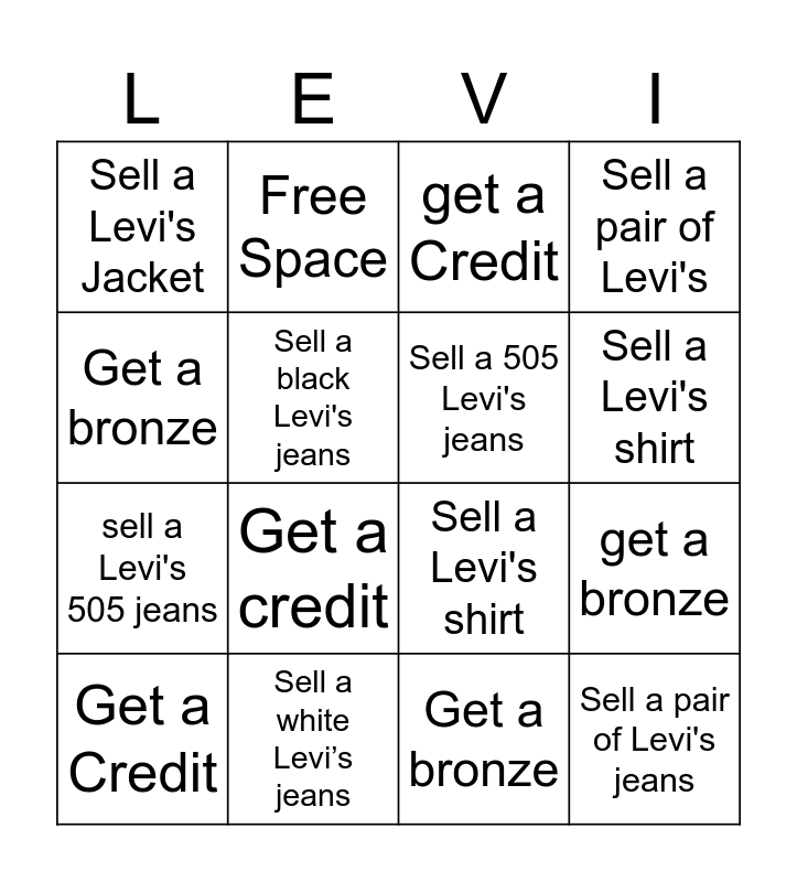 This bingo card has 16 words: Sell a white Levi’s jeans, get a bronze, get a Credit, Sell a Levi's Jacket, sell a Levi's 505 jeans, Free Space, Sell a Levi's shirt, Get a bronze, Get a bronze, Sell a black Levi's jeans, Get a Credit, Sell a pair of Levi's, Get a credit, Sell a Levi's shirt, Sell a 505 Levi's jeans and Sell a pair of Levi's jeans.