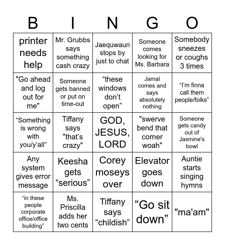This bingo card has a free space and 37 words: Ms. Netta “speeds” around that corner, Jasmine’s cousin comes to visit, Someone is invited on a walk, Someone gets banned or put on time-out, Auntie starts singing hymns, Keesha gets “serious”, “these windows don’t open”, Auntie says "a good-bye now", Somebody sneezes or coughs 3 times, Andrea refills her water bottle, Tiffany says "that’s crazy", Someone comes looking for Ms. Barbara, "ma'am", Someone gets candy out of Jasmine's bowl, "Go ahead and log out for me", Any system gives error message, Ms. Tiffani gets/has a look on her face, Jaequwaun stops by just to chat, Corey moseys over, "swerve bend that corner woah", printer needs help, “I’m finna call them people/folks”, “in these people corporate office/office building”, Tiffany says “childish”, name we can’t pronounce, “Go sit down”, Mr. Grubbs says something cash crazy, Andrea says “anyways / anywho”, Taylor gets pulled into the shenanigans, Sterling tries to laugh covertly, Auntie super sighs, Ms. Priscilla adds her two cents, “Something is wrong with you/y’all”, ANYONE + Sterling = “siblings wwe match”, Elevator goes down, Jamal comes and says absolutely nothing and Crazy/Scary DMV photo.