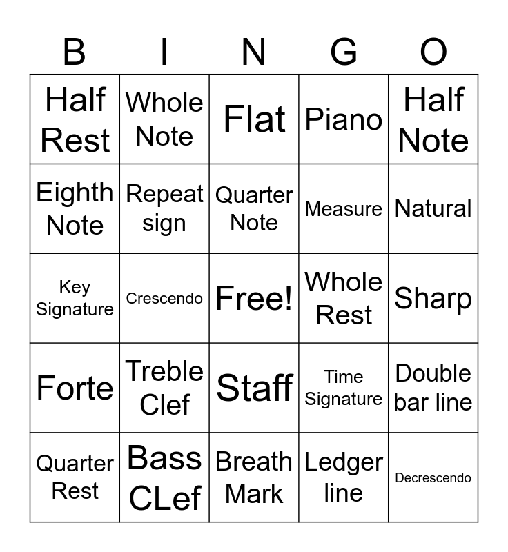 This bingo card has a free space and 24 words: Treble Clef, Bass CLef, Quarter Note, Quarter Rest, Half Note, Half Rest, Eighth Note, Whole Note, Whole Rest, Staff, Measure, Key Signature, Time Signature, Double bar line, Repeat sign, Ledger line, Sharp, Flat, Natural, Crescendo, Decrescendo, Forte, Piano and Breath Mark.