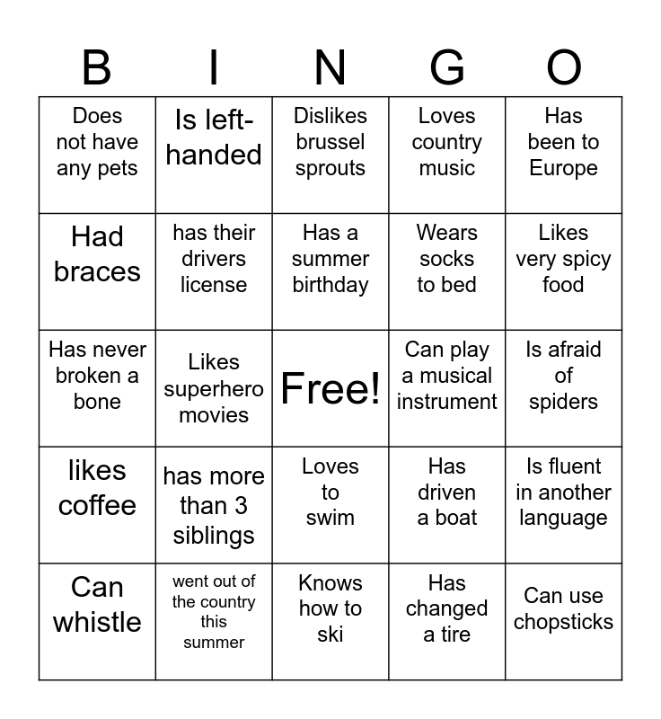 This bingo card has a free space and 24 words: has more than 3 siblings, went out of the country this summer, Has a summer birthday, Can whistle, Has been to Europe, Does not have any pets, Had braces, Is left-handed, Can play a musical instrument, Loves to swim, Wears socks to bed, Has never broken a bone, Has driven a boat, Is fluent in another language, has their drivers license, Has changed a tire, Is afraid of spiders, Dislikes brussel sprouts, Likes very spicy food, Likes superhero movies, Can use chopsticks, likes coffee, Loves country music and Knows how to ski.