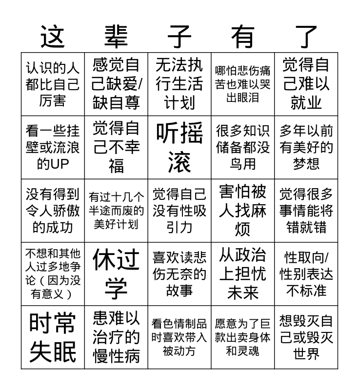 This bingo card has a free space and 24 words: 休过学, 患难以治疗的慢性病, 听摇滚, 时常失眠, 觉得自己难以就业, 认识的人都比自己厉害, 看一些挂壁或流浪的UP, 感觉自己缺爱/缺自尊, 害怕被人找麻烦, 喜欢读悲伤无奈的故事, 很多知识储备都没鸟用, 没有得到令人骄傲的成功, 从政治上担忧未来, 性取向/性别表达不标准, 觉得自己不幸福, 愿意为了巨款出卖身体和灵魂, 觉得很多事情能将错就错, 无法执行生活计划, 多年以前有美好的梦想, 有过十几个半途而废的美好计划, 想毁灭自己或毁灭世界, 不想和其他人过多地争论(因为没有意义), 哪怕悲伤痛苦也难以哭出眼泪 and 看色情制品时喜欢带入被动方.