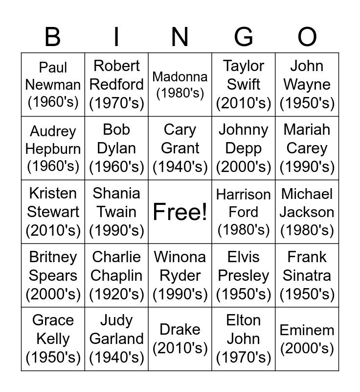 This bingo card has a free space and 24 words: Charlie Chaplin (1920's), Judy Garland (1940's), Cary Grant (1940's), Grace Kelly (1950's), John Wayne (1950's), Paul Newman (1960's), Audrey Hepburn (1960's), Robert Redford (1970's), Harrison Ford (1980's), Winona Ryder (1990's), Johnny Depp (2000's), Kristen Stewart (2010's), Elvis Presley (1950's), Frank Sinatra (1950's), Bob Dylan (1960's), Elton John (1970's), Michael Jackson (1980's), Madonna (1980's), Mariah Carey (1990's), Shania Twain (1990's), Eminem (2000's), Britney Spears (2000's), Taylor Swift (2010's) and Drake (2010's).