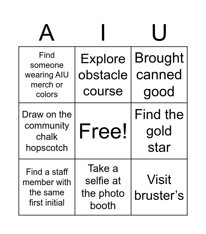 This bingo card has a free space and 12 words: High five bluey, Find Dr. Scherrer, Visit bruster’s, Find the gold star, Explore obstacle course, Brought canned good, Take a selfie at the photo booth, Take a photo with a mascot, Find someone wearing AIU merch or colors, Draw on the community chalk hopscotch, Find a staff member with the same first initial and Take a pic with your department.