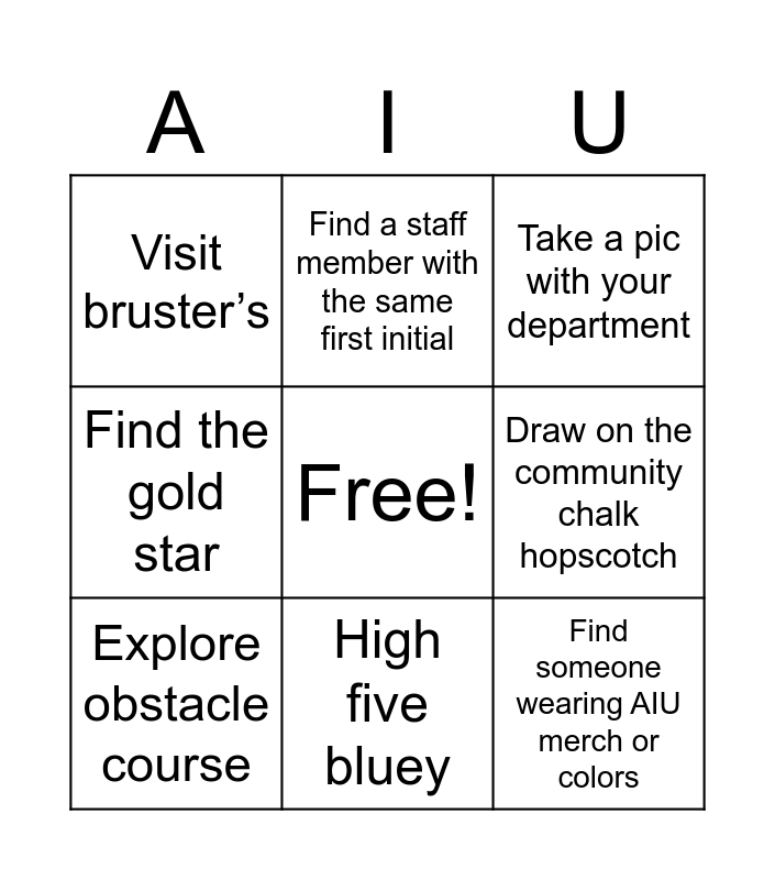This bingo card has a free space and 12 words: Take a selfie at the photo booth, Take a photo with a mascot, Find someone wearing AIU merch or colors, Draw on the community chalk hopscotch, Find a staff member with the same first initial, Take a pic with your department, High five bluey, Find Dr. Scherrer, Visit bruster’s, Find the gold star, Explore obstacle course and Brought canned good.