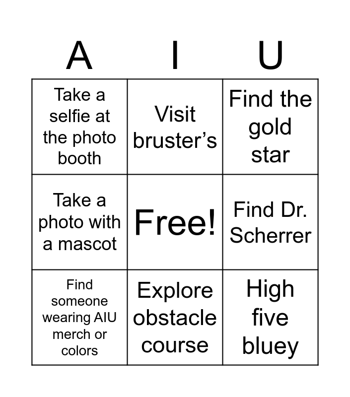 This bingo card has a free space and 12 words: Find a staff member with the same first initial, Take a pic with your department, High five bluey, Find Dr. Scherrer, Visit bruster’s, Find the gold star, Explore obstacle course, Brought canned good, Take a selfie at the photo booth, Take a photo with a mascot, Find someone wearing AIU merch or colors and Draw on the community chalk hopscotch.