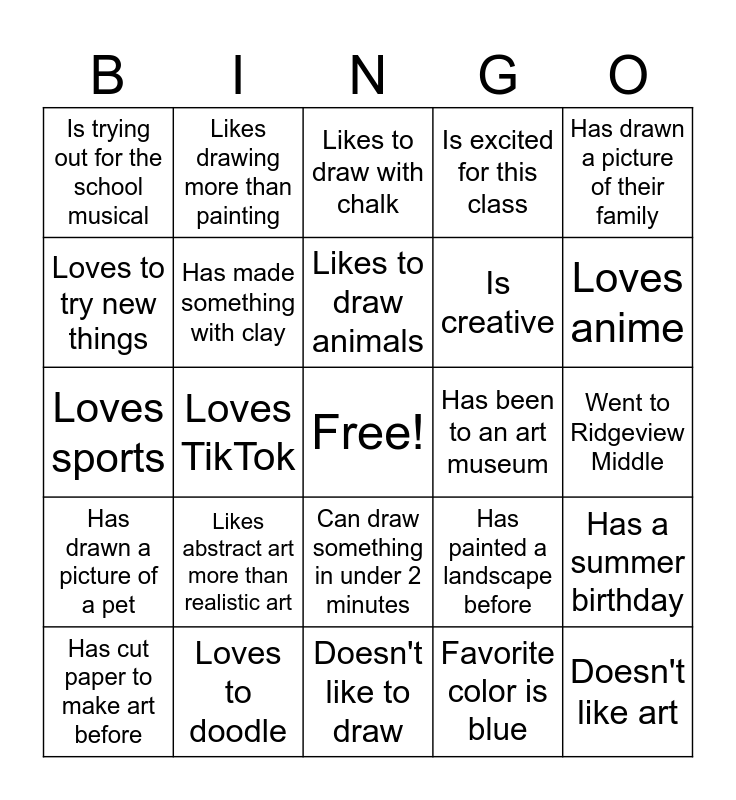 This bingo card has a free space and 34 words: Likes to draw with pencil, Favorite color is blue, This is their first art class at Riverside, Has never made art before, Has drawn a picture of a pet, Has made something with clay, Has drawn a picture of their family, Has cut paper to make art before, Likes drawing more than painting, Has made art with fabric or string, Likes to draw animals, Likes to draw with chalk, Likes to paint with watercolors, Has their own sketchbook, Has been to an art museum, Loves anime, Loves to doodle, Loves sports, Likes abstract art more than realistic art, Has painted a landscape before, Can draw something in under 2 minutes, Loves music, Is trying out for the school musical, Went to Ridgeview Middle, Doesn't like to draw, Doesn't like art, Is excited for this class, Is NOT excited for this class, Is creative, Loves to try new things, Likes gym class more than art class, Loves TikTok, Has a summer birthday and Has a winter birthday.