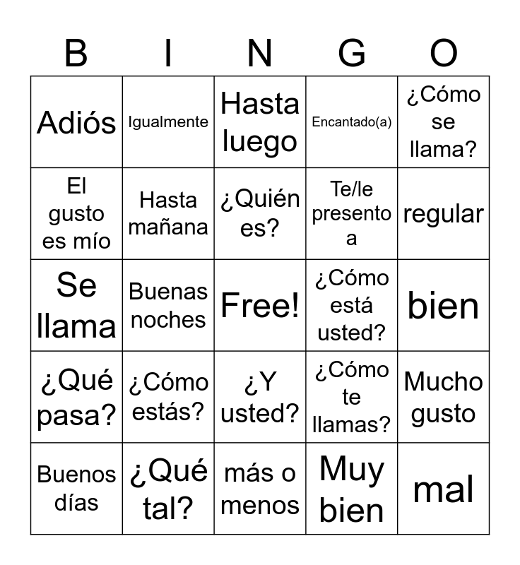 This bingo card has a free space and 29 words: Buenos días, Buenas tardes, Buenas noches, Hola, Adiós, Hasta luego, Hasta mañana, ¿Cómo estás?, ¿Cómo está usted?, ¿Qué tal?, bien, mal, más o menos, Muy bien, regular, ¿Y tú?, ¿Y usted?, ¿Qué pasa?, ¿Cómo se llama?, Se llama, ¿Cómo te llamas?, Me llamo, Te/le presento a, El gusto es mío, Encantado(a), Igualmente, Mucho gusto, ¿Quién es? and Es.
