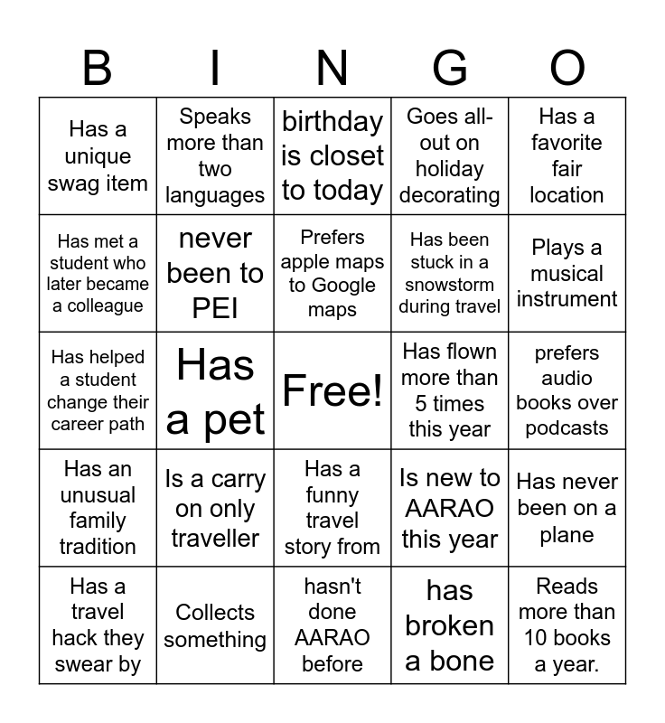 This bingo card has a free space and 25 words: Is a carry on only traveller, hasn't done AARAO before, Prefers apple maps to Google maps, Has a travel hack they swear by, Has a favorite fair location, Has a unique swag item, Has met a student who later became a colleague, Speaks more than two languages, Has flown more than 5 times this year, Has a funny travel story from, Has been stuck in a snowstorm during travel, Has helped a student change their career path, Is new to AARAO this year, Has never been on a plane, never been to PEI, Saw someone Famous in an Airport, prefers audio books over podcasts, birthday is closet to today, Plays a musical instrument, Has a pet, Reads more than 10 books a year., Collects something, Has an unusual family tradition, Goes all-out on holiday decorating and has broken a bone.