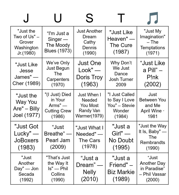 This bingo card has 35 words: Just Dance Lady Gaga (2008), Just the Way You Are Bruno Mars (2010), Just a Kiss Lady Antebellum (2011), We’ve Only Just Begun The Carpenters (1970), "Just What I Needed" — The Cars (1978), "Just Like Heaven" — The Cure (1987), "Just Like Jesse James" — Cher (1989), Just a Little Too Much Ricky Nelson 1959, Just One Look" — Doris Troy (1963), "I Just Want to Celebrate" – Rare Earth (1971), "Just the Way You Are" – Billy Joel (1977), "Just My Imagination" – The Temptations (1971), "Girls Just Want to Have Fun" – Cyndi Lauper (1983), "Just Can't Get Enough" – Depeche Mode (1981), "Just the Two of Us" – Grover Washington Jr.(1980), "I Just Called to Say I Love You" – Stevie Wonder (1984), "Just a Friend" – Biz Markie (1989), "(I Just) Died in Your Arms" — Cutting Crew (1986), "Just Got Lucky" — JoBoxers (1983), Just When I Needed You Most Randy Van Warmer(1979), "Just a Girl" — No Doubt (1995), "Just Another Day" — Jon Secada (1992), "Just the Way It Is, Baby" — The Rembrandts (1990), "That’s Just the Way It Is" — Phil Collins (1990), Just Another Dream Cathy Dennis (1990), “Just Like a Pill” – P!nk (2002), “Just Another Day in Paradise” – Phil Vassar (2000), “Just in Case” – Morgan Wallen (2025), Why Don’t We Just Dance Josh Turner 2009, Just Between You and Me April Wine ‧ 1981, Just a Kiss Lady Antebellum 2011, “Just a Dream” — Nelly (2010), “Just Breathe” — Pearl Jam (2009), “I'm Just a Singer — The Moody Blues (1973) and “Just to See You Smile” – Tim McGraw (1997).