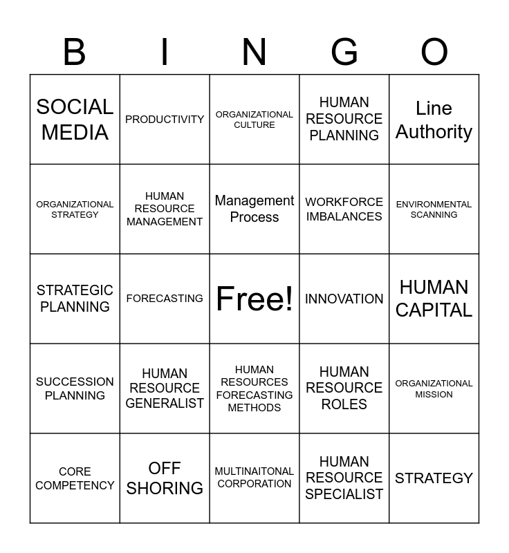 This bingo card has a free space and 24 words: CORE COMPETENCY, HUMAN RESOURCE GENERALIST, Management Process, HUMAN RESOURCE SPECIALIST, Line Authority, SOCIAL MEDIA, PRODUCTIVITY, ORGANIZATIONAL CULTURE, INNOVATION, HUMAN CAPITAL, STRATEGIC PLANNING, HUMAN RESOURCE MANAGEMENT, HUMAN RESOURCE ROLES, ORGANIZATIONAL MISSION, ORGANIZATIONAL STRATEGY, OFF SHORING, MULTINAITONAL CORPORATION, HUMAN RESOURCE PLANNING, ENVIRONMENTAL SCANNING, SUCCESSION PLANNING, FORECASTING, HUMAN RESOURCES FORECASTING METHODS, WORKFORCE IMBALANCES and STRATEGY.