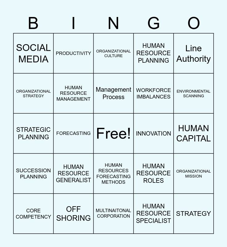 This bingo card has a free space and 24 words: CORE COMPETENCY, HUMAN RESOURCE GENERALIST, Management Process, HUMAN RESOURCE SPECIALIST, Line Authority, SOCIAL MEDIA, PRODUCTIVITY, ORGANIZATIONAL CULTURE, INNOVATION, HUMAN CAPITAL, STRATEGIC PLANNING, HUMAN RESOURCE MANAGEMENT, HUMAN RESOURCE ROLES, ORGANIZATIONAL MISSION, ORGANIZATIONAL STRATEGY, OFF SHORING, MULTINAITONAL CORPORATION, HUMAN RESOURCE PLANNING, ENVIRONMENTAL SCANNING, SUCCESSION PLANNING, FORECASTING, HUMAN RESOURCES FORECASTING METHODS, WORKFORCE IMBALANCES and STRATEGY.