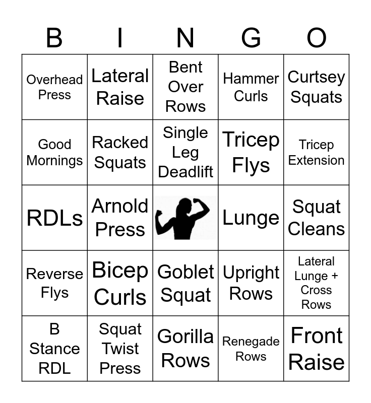 This bingo card has a free space and 24 words: Bicep Curls, Squat Twist Press, Single Leg Deadlift, B Stance RDL, Curtsey Squats, Overhead Press, Good Mornings, Lateral Raise, Lunge, Goblet Squat, Tricep Flys, RDLs, Upright Rows, Lateral Lunge + Cross Rows, Racked Squats, Renegade Rows, Squat Cleans, Bent Over Rows, Tricep Extension, Arnold Press, Front Raise, Reverse Flys, Hammer Curls and Gorilla Rows.