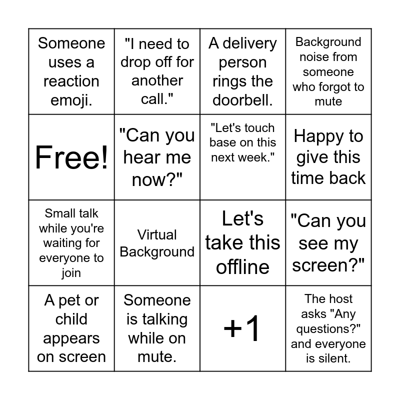 This bingo card has 16 words: Someone is talking while on mute., "Can you see my screen?", A delivery person rings the doorbell., Someone uses a reaction emoji., Small talk while you're waiting for everyone to join, "I need to drop off for another call.", Let's take this offline, +1, Free!, "Can you hear me now?", A pet or child appears on screen, Background noise from someone who forgot to mute, Virtual Background, Happy to give this time back, "Let's touch base on this next week." and The host asks "Any questions?" and everyone is silent..
