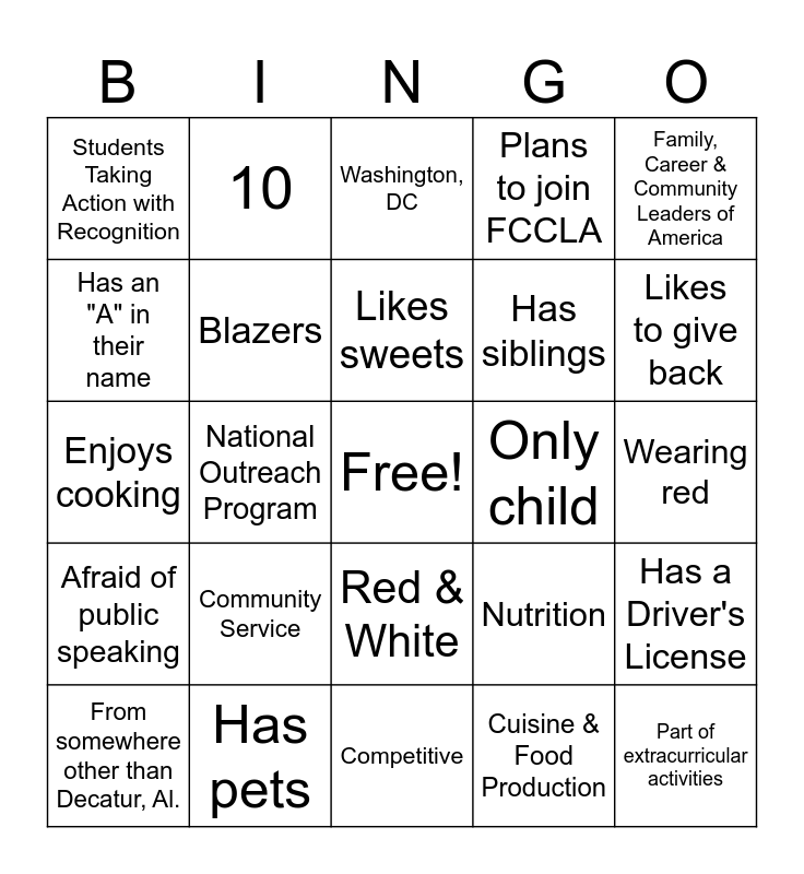 This bingo card has a free space and 24 words: Community Service, Has pets, Likes sweets, From somewhere other than Decatur, Al., Family, Career & Community Leaders of America, Students Taking Action with Recognition, Has an "A" in their name, 10, Only child, Red & White, Has siblings, Enjoys cooking, Nutrition, Has a Driver's License, Blazers, Cuisine & Food Production, Wearing red, Washington, DC, Likes to give back, National Outreach Program, Part of extracurricular activities, Afraid of public speaking, Plans to join FCCLA and Competitive.