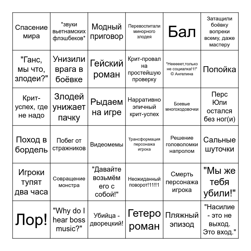 This bingo card has 36 words: Неожиданный поворот!11!!1, "Давайте возьмём его с собой!", Гетеро роман, "Ганс, мы что, злодеи?", Поход в бордель, Нарративно эпичный крит-успех, Унизили врага в боёвке, Убийца - дворецкий!, Бал, Смерть персонажа игрока, Попойка, Перевоспитали минорного злодея, "Мы же тебя убили!", Злодей унижает пачку, Крит-провал на простейшую проверку, Спасение мира, Игроки тупят два часа, Боевые многоходовочки, Крит-успех, где не надо, Модный приговор, Рыдаем на игре, Побег от стражников, Трансформация персонажа игрока, Видеомемы, Решение головоломки напролом, *звуки вьетнамских флэшбеков*, "Нееееет,только не социалка!1!" © Ангелина, "Why do I hear boss music?", Гейский роман, Затащили боёвку вопреки всему, даже мастеру, "Насилие - это не выход. Это вход.", Лор!, Сальные шуточки, Перс Юли остался без ног(и), Совращение монстра and Пляжный эпизод.