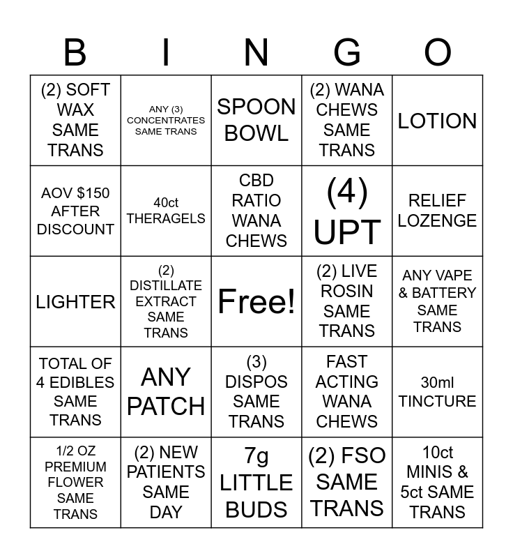 This bingo card has a free space and 24 words: ANY PATCH, (2) NEW PATIENTS SAME DAY, CBD RATIO WANA CHEWS, 1/2 OZ PREMIUM FLOWER SAME TRANS, LOTION, (2) SOFT WAX SAME TRANS, AOV $150 AFTER DISCOUNT, ANY (3) CONCENTRATES SAME TRANS, (2) LIVE ROSIN SAME TRANS, (3) DISPOS SAME TRANS, (4) UPT, LIGHTER, FAST ACTING WANA CHEWS, 30ml TINCTURE, 40ct THERAGELS, (2) FSO SAME TRANS, ANY VAPE & BATTERY SAME TRANS, SPOON BOWL, RELIEF LOZENGE, (2) DISTILLATE EXTRACT SAME TRANS, 10ct MINIS & 5ct SAME TRANS, TOTAL OF 4 EDIBLES SAME TRANS, (2) WANA CHEWS SAME TRANS and 7g LITTLE BUDS.