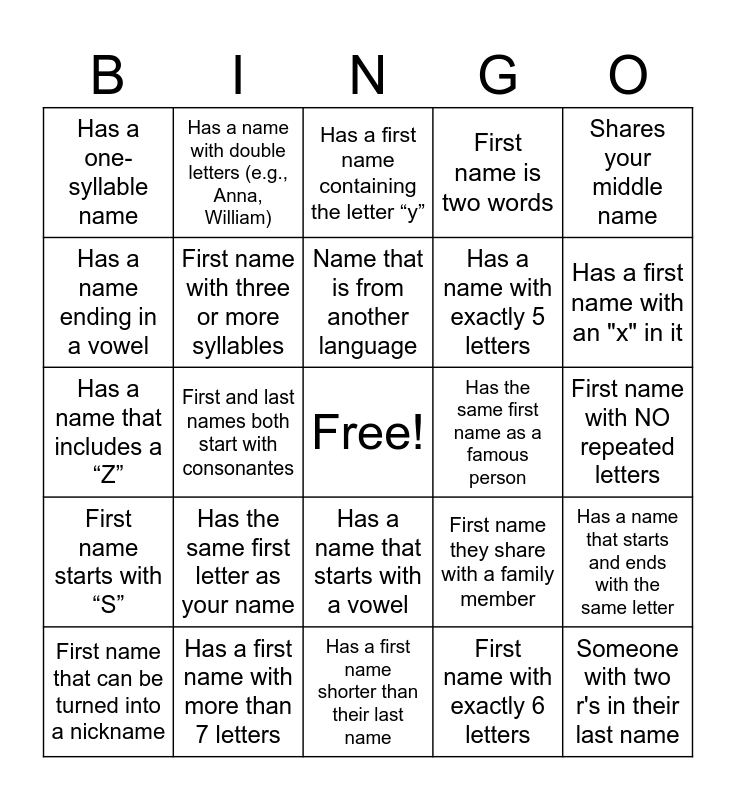This bingo card has a free space and 24 words: Has the same first letter as your name, Has a first name with more than 7 letters, Name that is from another language, First name that can be turned into a nickname, Shares your middle name, Has a one-syllable name, Has a name ending in a vowel, Has a name with double letters (e.g., Anna, William), Has the same first name as a famous person, Has a name that starts with a vowel, Has a name with exactly 5 letters, Has a name that includes a “Z”, First name they share with a family member, Has a name that starts and ends with the same letter, First name with three or more syllables, First name with exactly 6 letters, First name with NO repeated letters, Has a first name containing the letter “y”, Has a first name with an "x" in it, First and last names both start with consonantes, Someone with two r's in their last name, First name starts with “S”, First name is two words and Has a first name shorter than their last name.