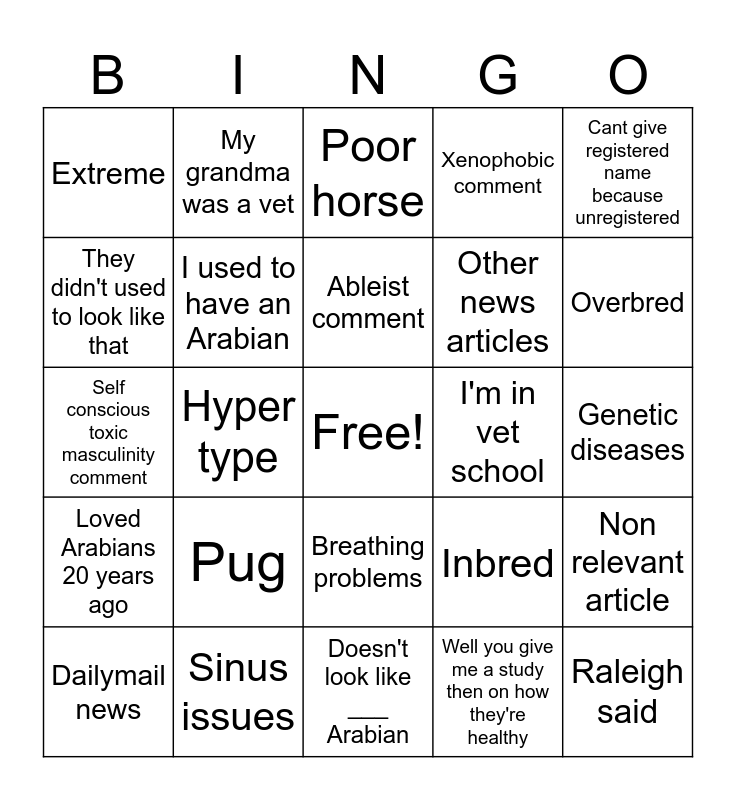 This bingo card has a free space and 24 words: Dailymail news, Pug, Ableist comment, Well you give me a study then on how they're healthy, Cant give registered name because unregistered, Extreme, My grandma was a vet, Poor horse, I'm in vet school, Genetic diseases, Self conscious toxic masculinity comment, I used to have an Arabian, Inbred, Non relevant article, They didn't used to look like that, Sinus issues, Doesn't look like ___ Arabian, Xenophobic comment, Overbred, Loved Arabians 20 years ago, Hyper type, Breathing problems, Other news articles and Raleigh said.