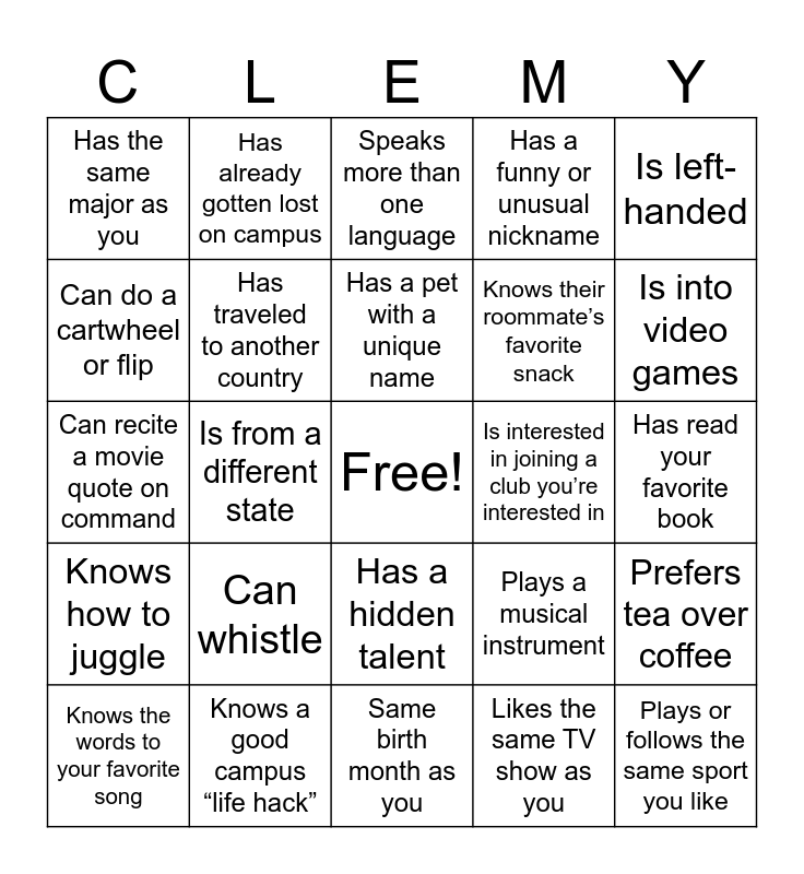 This bingo card has a free space and 31 words: Same birth month as you, Has a sibling in college, Is from a different state, Is a first-generation college student, Has the same major as you, Speaks more than one language, Has traveled to another country, Plays a musical instrument, Is interested in joining a club you’re interested in, Likes the same TV show as you, Has read your favorite book, Plays or follows the same sport you like, Enjoys hiking or being outdoors, Loves to cook or bake, Is into video games, Is a morning person, Prefers tea over coffee, Can whistle, Knows how to juggle, Has a hidden talent, Is left-handed, Can roll their tongue, Knows the words to your favorite song, Has already gotten lost on campus, Knows their roommate’s favorite snack, Can do a cartwheel or flip, Has a funny or unusual nickname, Can recite a movie quote on command, Knows a good campus “life hack”, Has a pet with a unique name and Owns an unusual pair of socks.