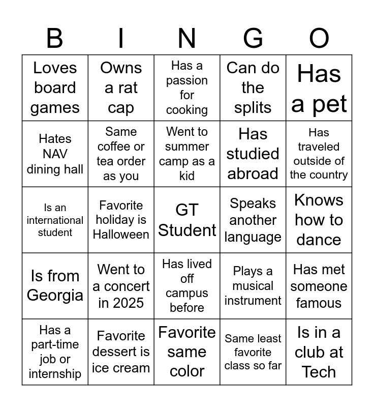 This bingo card has a free space and 29 words: Has a part-time job or internship, Same major as you, Favorite holiday is Halloween, Same favorite artist or band, Loves board games, Has a passion for cooking, Same coffee or tea order as you, Went to a concert in 2025, Speaks another language, Favorite dessert is ice cream, Knows how to dance, Is in a club at Tech, Favorite same color, Same least favorite class so far, Has traveled outside of the country, Birthday the same month as you, Has lived off campus before, Is from Georgia, Has a pet, Is an international student, Plays a musical instrument, Same favorite movie as you, Has studied abroad, Hates NAV dining hall, Can do the splits, Owns a rat cap, Has met someone famous, Went to summer camp as a kid and Favorite season is fall.