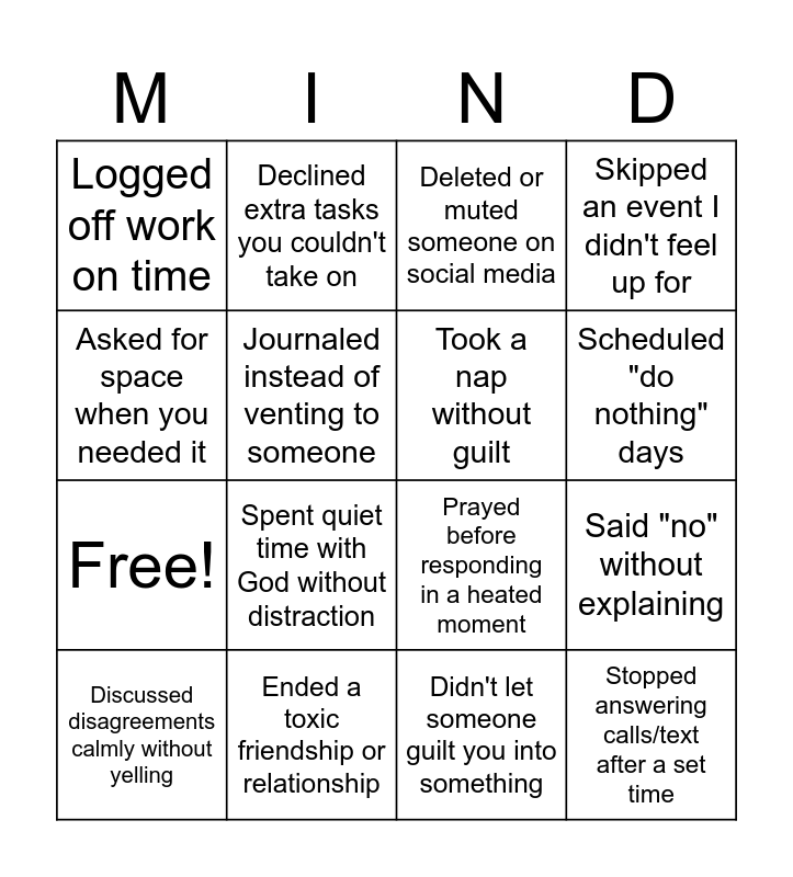 This bingo card has 20 words: Said "no" without explaining, Took a day just for yourself, Deleted or muted someone on social media, Didn't answer a call/text right away and felt okay about it, Discussed disagreements calmly without yelling, Asked for space when you needed it, Ended a toxic friendship or relationship, Logged off work on time, Free!, Declined extra tasks you couldn't take on, Spent quiet time with God without distraction, Prayed before responding in a heated moment, Journaled instead of venting to someone, Stopped answering calls/text after a set time, Took a nap without guilt, Asked for help, Scheduled "do nothing" days, Skipped an event I didn't feel up for, Didn't let someone guilt you into something and Spoke up when something was bothering you.
